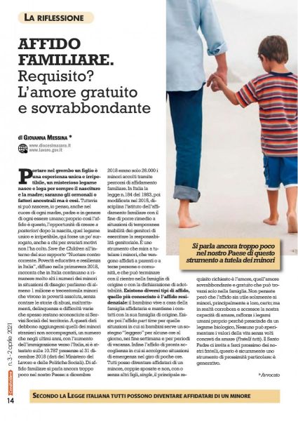 Infine l’affido di pronta accoglienza in cui si accolgono situazioni di emergenza nel giro di poche ore. Tutti posso diventare affidatari di un minore, coppie sposate e non, con o senza altri figli, single, il principale requisito richiesto è l’amore, quell’amore sovrabbondante e gratuito che può trovarsi solo nella famiglia. Non pensate però che l’affido sia utile solamente ai minori, principalmente a loro, certo; ma in realtà corrobora e accresce la nostra capacità di amare, rafforza i legami umani proprio perché prescinde da un legame biologico, Nessuno può sperimentare i valori della vita senza volti concreti da amare (Fratelli tutti). Il Santo Padre ci invita a farci prossimo dei nostri fratelli, questo è sicuramente uno strumento di prossimità particolare: è generativo.