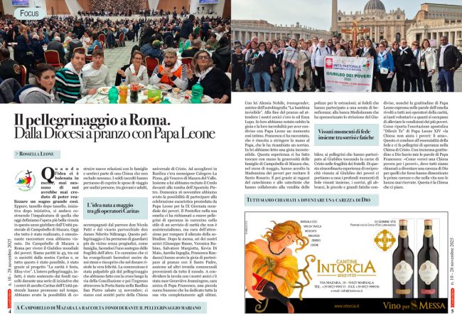 In loro abbiamo notato subito la gioia e la loro incredulità per aver condiviso con Papa Leone un momento così intimo. Francesca ci ha raccontato, che è riuscita a stringere la mano al Papa, che le ha ricambiato un sorriso. In lei abbiamo letto una gioia incontenibile. Questa esperienza ci ha fatto toccare con mano la generosità delle famiglie di Campobello di Mazara che, nel mese di maggio, hanno accolto la Madonnina dei poveri per recitare il Santo Rosario. E poi grazie ai ragazzi del catechismo e alle catechiste che hanno collaborato alla vendita delle polizze per le estrazioni; ai fedeli che hanno partecipato a una serata di beneficenza; alla banca Mediolanum che ha sponsorizzato lo striscione del Giubileo; ai pellegrini che hanno partecipato al Giubileo toccando la carne di Cristo nelle fragilità dei fratelli. Di questa straordinaria esperienza di reciprocità vissuta al Giubileo dei poveri ci portiamo a casa i profondi momenti di fede vissuti insieme, i sorrisi, gli abbracci, le piccole e grandi fatiche condivise, nonché la gratitudine di Papa Leone espressa nelle parole dell’omelia rivolti a tutti noi operatori della carità, ai tanti volontari e a quanti si occupano di alleviare le condizioni dei più poveri.