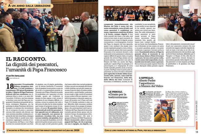 18 i pescatori, 3 le nazionalità (italiana, senegalese, tunisina), 2 le fedi (cristiana e musulmana), 108 i giorni di prigionia in Libia, l’Angelus di Papa Francesco dedicato alla loro condizione: ora, finalmente liberi e rinati, a un anno dall’accaduto, 13 di loro e per loro, insieme ai familiari, sono stati dal Papa per ringraziarlo. Il desiderio più grande del Vescovo, monsignor Domenico Mogavero, era far partecipe lo stesso Francesco del lavoro sinergico e in sintonia che i tre sindacati che si occupano di pesca e pescatori avevano fatto insieme alla Diocesi: «un vero cammino sinodale» continuava a ripetere fin dal volo verso Roma, «bisogna che il Santo Padre lo ascolti come testimonianza» aggiungeva contento.