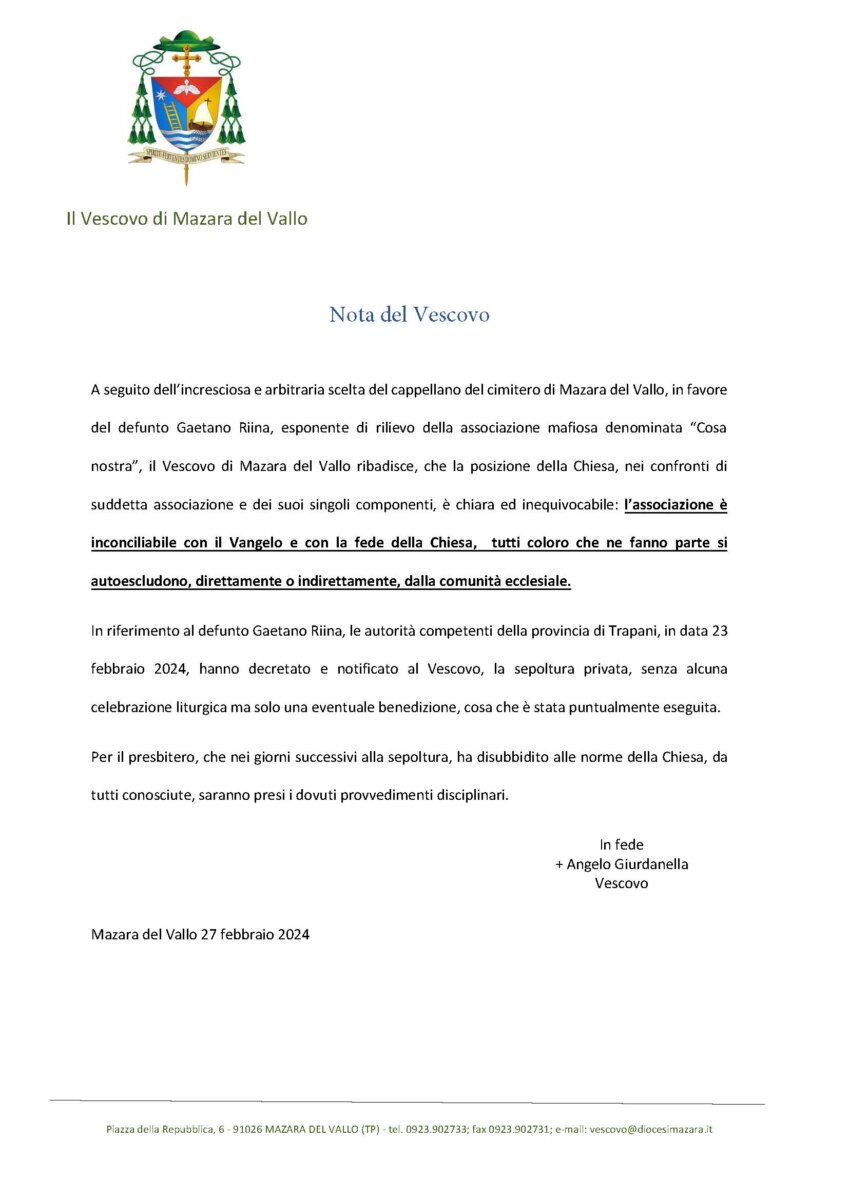 «A seguito dell’incresciosa e arbitraria scelta del cappellano del cimitero di Mazara del Vallo, in favore del defunto Gaetano Riina, esponente di rilievo della associazione mafiosa denominata “Cosa nostra”, il Vescovo della Diocesi di Mazara del Vallo ribadisce che la posizione della Chiesa nei confronti di suddetta associazione e dei suoi singoli componenti, è chiara ed inequivocabile: l’associazione inconciliabile con il Vangelo e con la fede della Chiesa, tutti coloro che ne fanno parte si autoescludono, direttamente o indirettamente, dalla comunità ecclesiale. In riferimento al defunto Gaetano Riina, le autorità competenti della provincia di Trapani, in data 23 febbraio 2024, hanno decretato e notificato al Vescovo, la sepoltura privata, senza alcuna celebrazione liturgica ma solo una eventuale benedizione, cosa che è stata puntualmente eseguita. Per il presbitero, che nei giorni successivi alla sepoltura, ha disubbidito alle norme della Chiesa, da tutti conosciute, saranno presi i dovuti provvedimenti disciplinari». Lo dice il Vescovo di Mazara del Vallo monsignor Angelo Giurdanella.